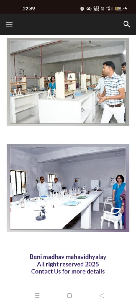 “बेनी माधव महाविद्यालय” में हम यह मानते हैं कि सिद्धांत (Theory) तभी सार्थक है जब उसे व्यवहार (Practical) में उतारा जाए। इसी उद्देश्य से महाविद्यालय में आधुनिक एवं सुसज्जित प्रयोगशालाएँ (Laboratories) उपलब्ध कराई गई हैं। यहाँ छात्राओं को अपने विषयों से संबंधित प्रयोगों, अनुसंधान और नवाचार की गहन जानकारी प्राप्त करने का अवसर मिलता है।